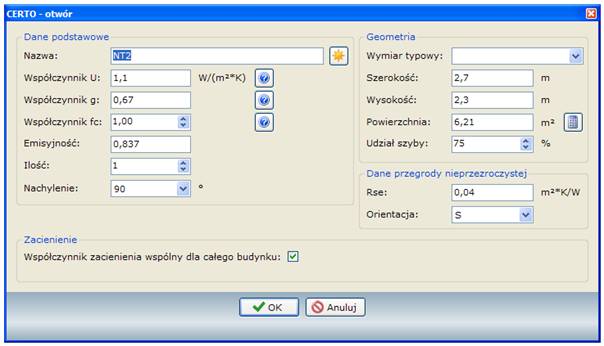 W przypadku definiowania otworu należ zwrócić uwagę na 2 dodatkowe pola, które dla przestrzeni ogrzewanych definiuje się w danych przegrody, tj. opór R oraz orientacja, przykład: